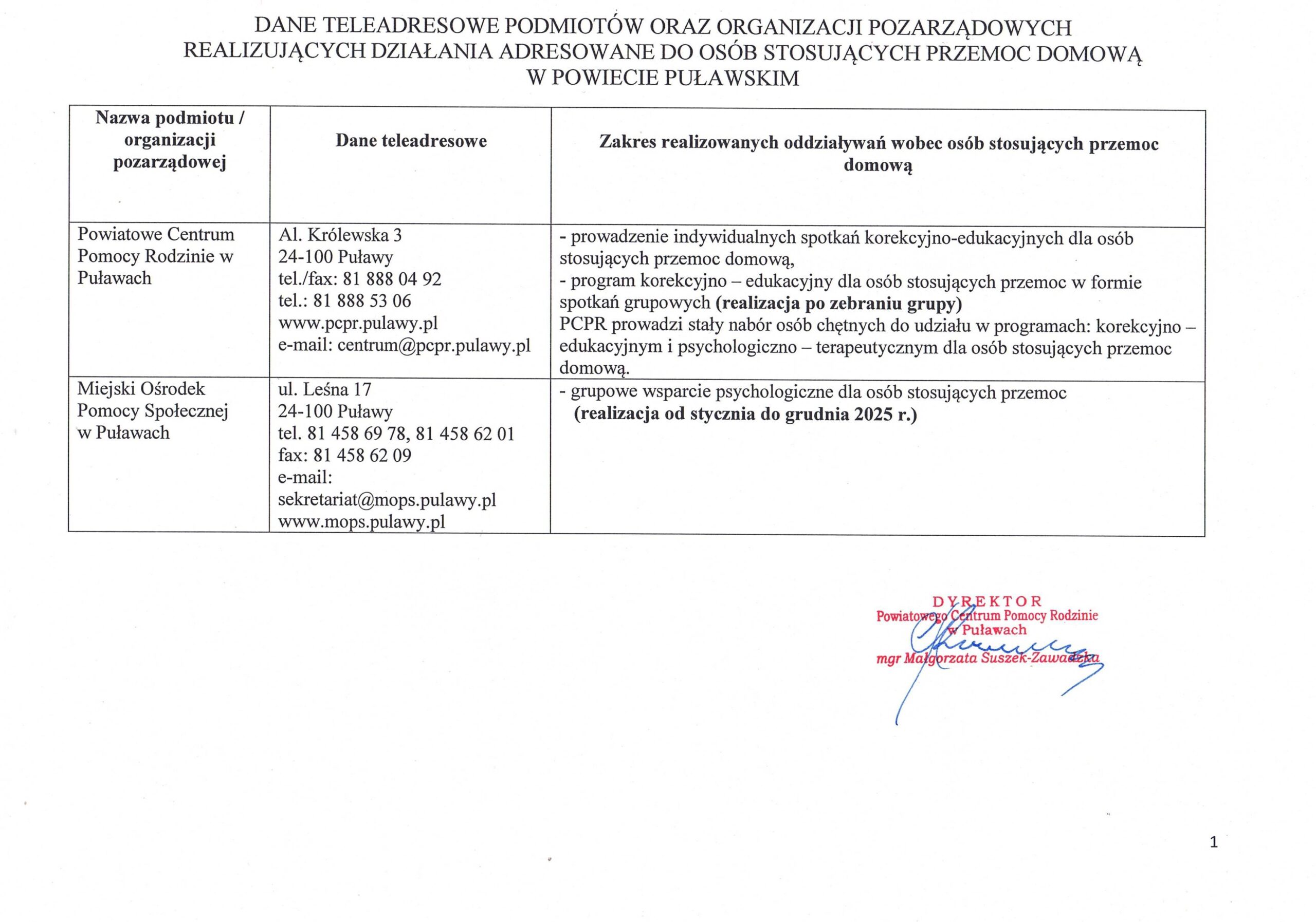Dane teleadresowe podmiotów oraz organizacji pozarządowych z terenu powiatu puławskiego realizujących działania adresowane do osób stosujących przemoc domową