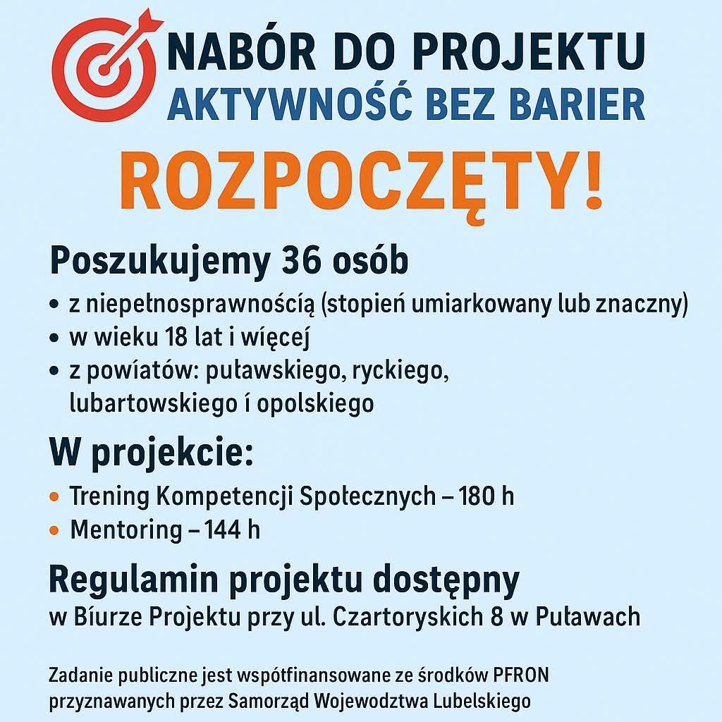 Projekt skierowany jest do osób z niepełnosprawnością w stopniu umiarkowanym lub znacznym w wieku 18+ zamieszkujących powiaty: puławski, rycki, lubartowski i opolski. Udział w projekcie jest całkowicie bezpłatny.